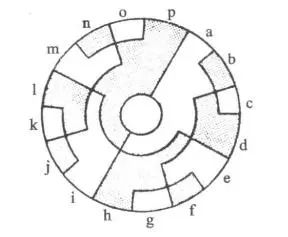 直接二进制码盘虽然简单,但是对码盘的制作和安装要求很严格,否则容易出错。例如,下图所示的4位二进制码盘,当电刷由h(0111)向位置i(1000)过渡时,本来是7变为8,但若电刷进入导电区的先后有差别,就可能岀现8〜15之间的任一十进制数,造成的误差可能相当大。为了解决这一问题,通常采用的方法之一是应用循环码盘。