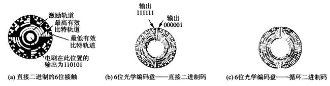 由敏感元件和码盘所组成,所以对采用不同的敏感元件,码盘的制造和形式也不同。下图示出了三种典型的绝对轴编码盘。最常用的绝对值编码器有接触编码器、光学编码器和磁性编码器。
